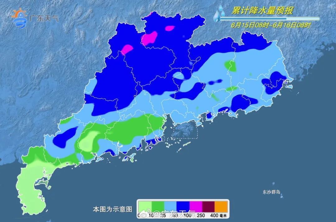 15日,粤北、粤东和珠江三角洲北部市县有暴雨到大暴雨,局部特大暴雨,其余市县有中到大雨,局部暴雨。